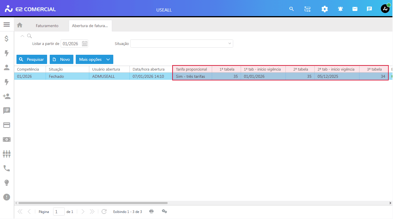 Caminho: E2 Comercial > Faturamento > Encerrar mês > Buscar pela competência > Encerrar.