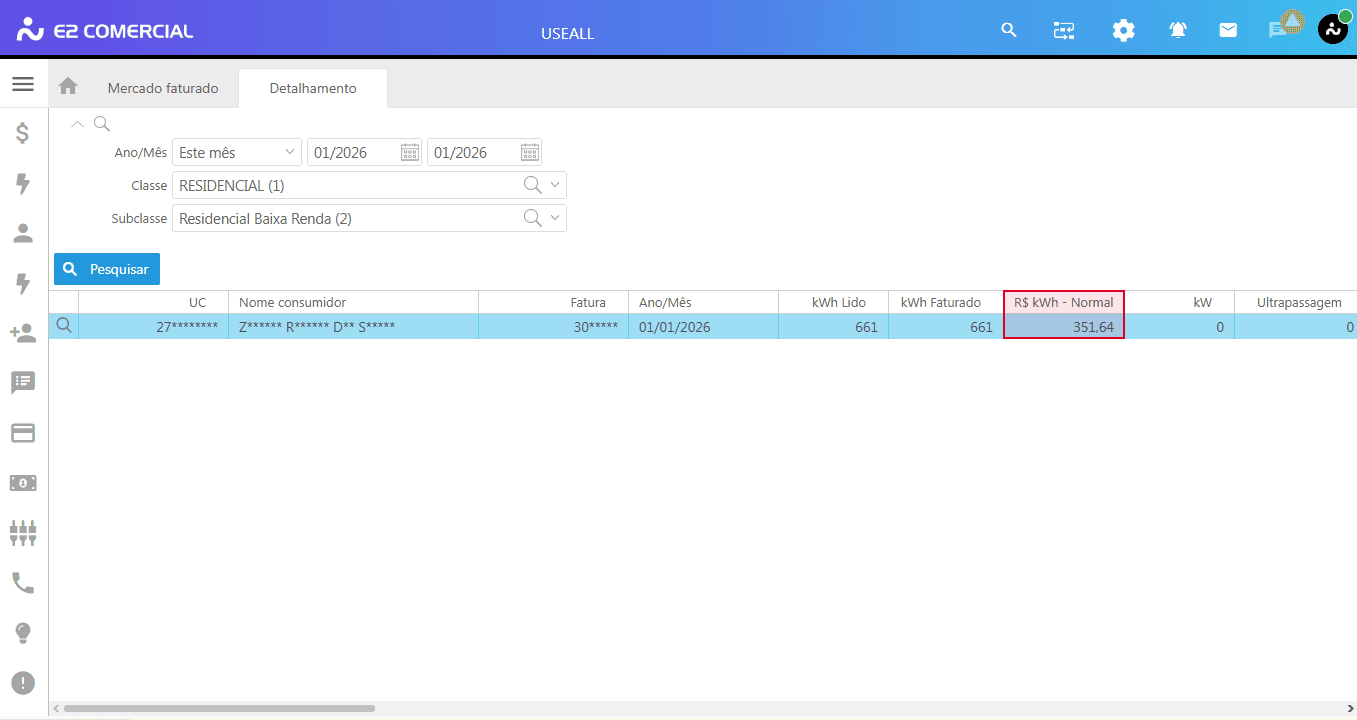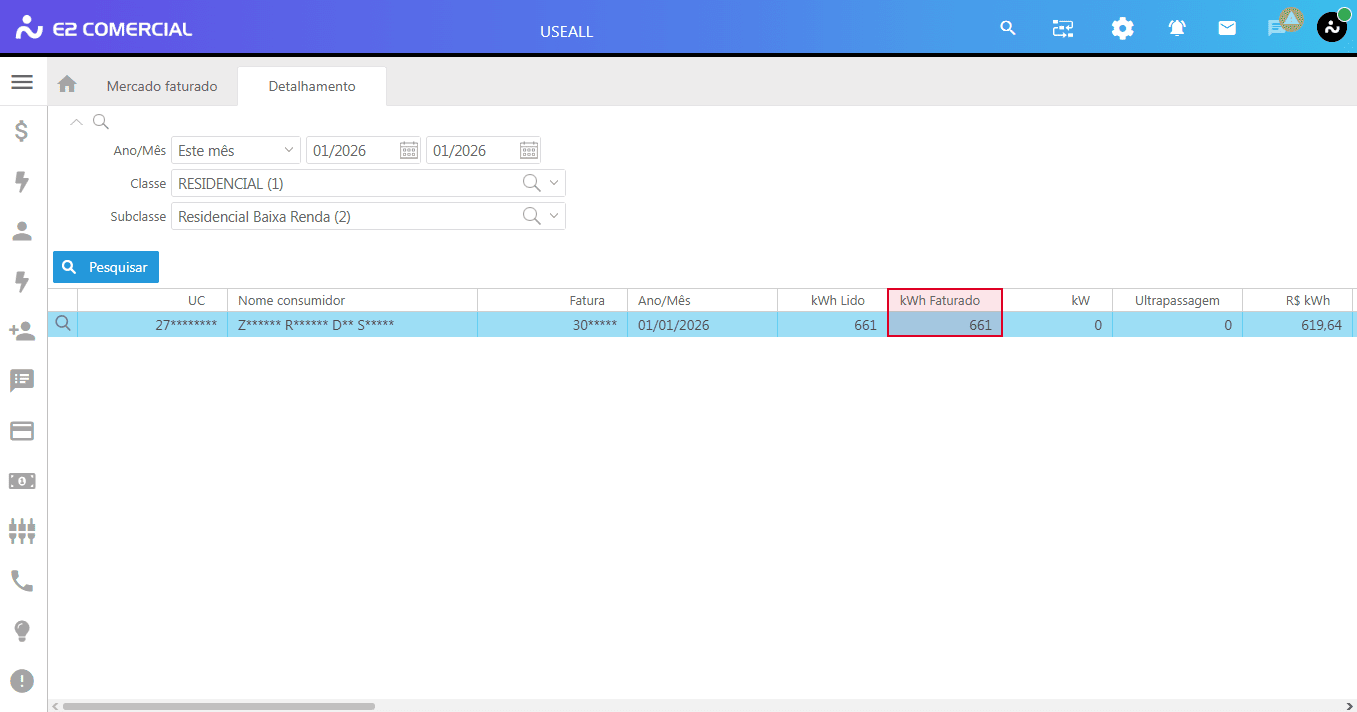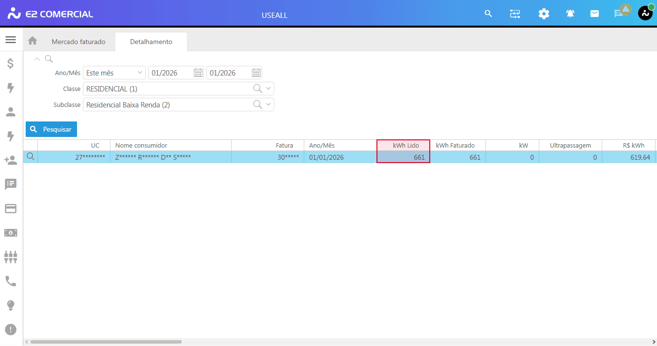- Caminho: E2 Com > Faturamento > Mercado Faturado > Selecionar Classe e em seguida a subclasse > Buscar a UC desejada > Verificar a coluna kWh Lido.