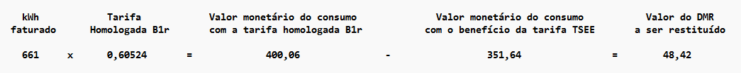 Nesta fatura de exemplo, houve um consumo de 245 kWh, onde uma única separação referente a tarifa TSEE foi aplicada. Assim, na primeira linha observa-se a isenção total até os primeiros 80 kWh e em seguida uma nova linha com os 165 kWh restantes faturados com a tarifa plena B1r.