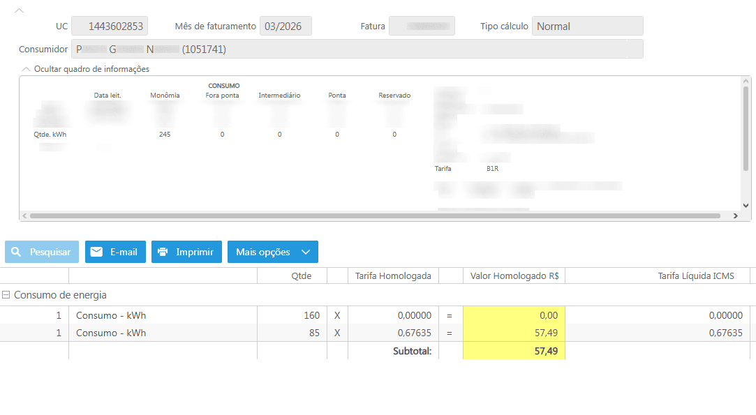 É possível observar que o consumo da unidade foi de 245 kWh, onde 160 kWh foram isentos de pagamento, enquanto os 85 kWh restantes foram faturados com a tarifa plena B1r. Neste caso, trata-se de uma unidade multifamiliar com duas famílias.