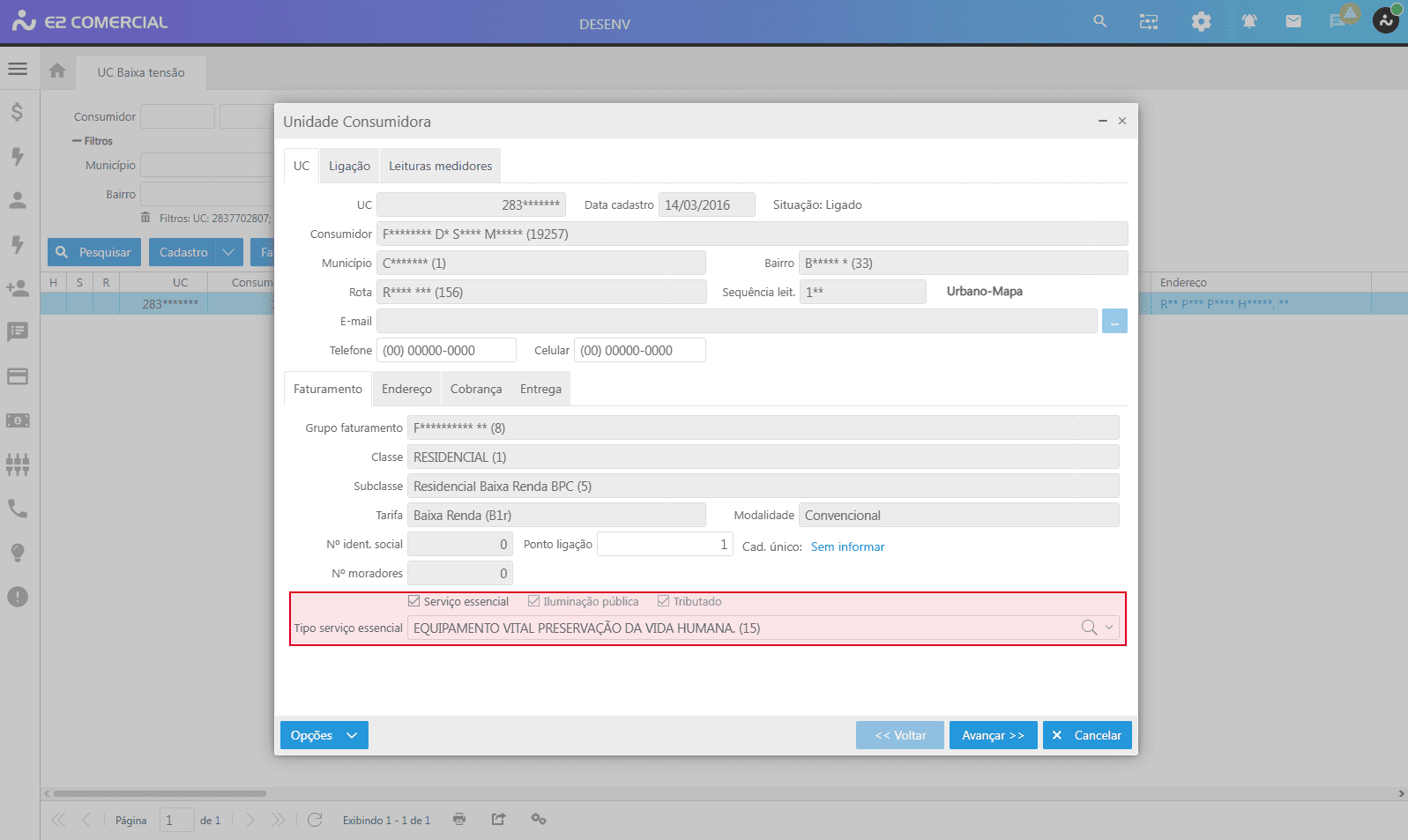 - Caminho: E2Com > Comercial > Baixa tensão > Unidade consumidora > Buscar pela UC > Duplo clique no registro da unidade > Na parte inferior da tela, na aba Faturamento conferir o checkbox Serviço essencial, ao seleciona-lo um novo campo será apresentado, o Tipo serviço essencial para definição da finalidade de utilização do consumidor.