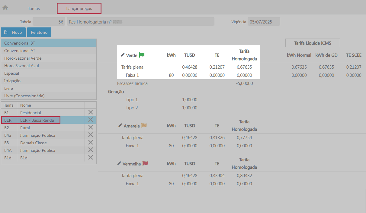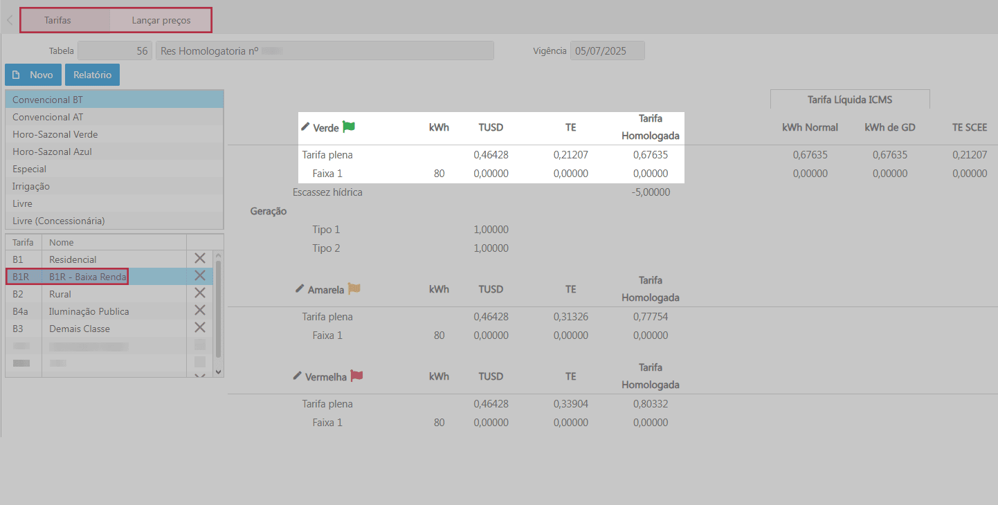 - Caminho: E2 Com > Faturamento > Mercado Faturado > Selecionar Classe e em seguida a subclasse > Buscar a UC desejada > Verificar a coluna R$ kWh - Normal para unidades com modalidade tarifária convencional.