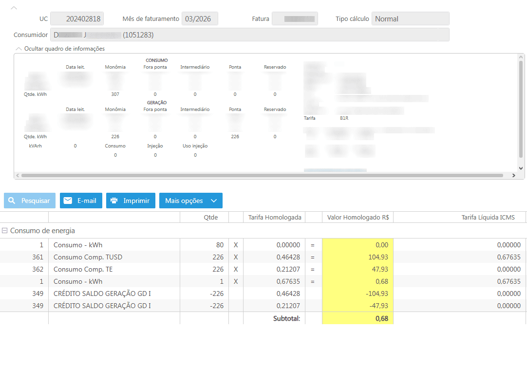 No sistema a fatura é apresentada da seguinte forma.