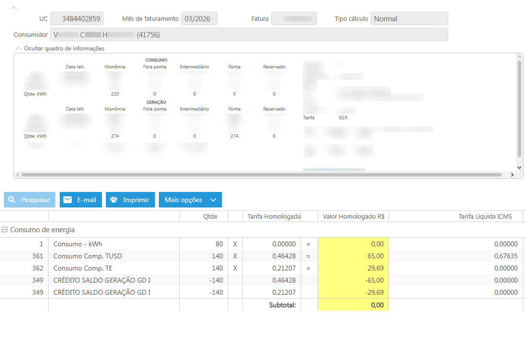 A fatura conta com duas divisões para o valor de kWh consumido, uma linha até 80 kWh totalmente isentos e outra linha com os 140 kWh restantes faturados com base nos valores das tarifas plenas B1r correspondentes a TUSD e TE.