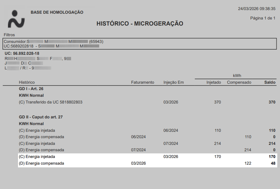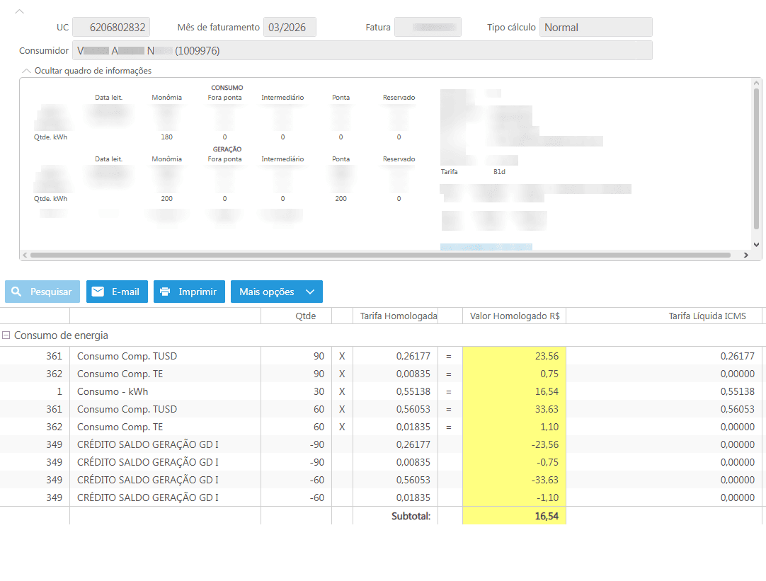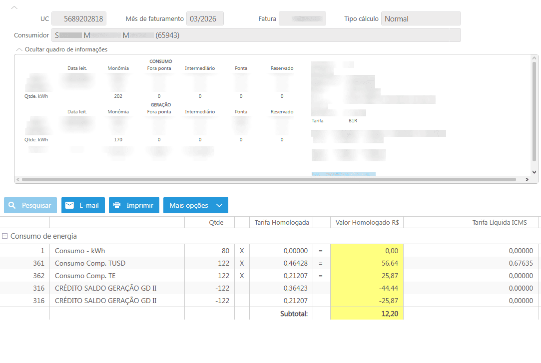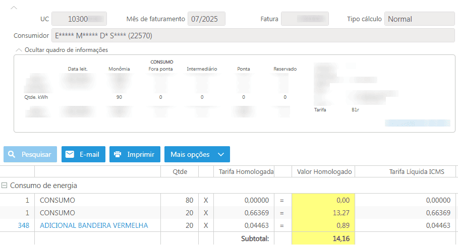 No espelho do documento fiscal é possível observar os kWh faturados divididos em mais de duas linhas. Isso ocorre por conta da aplicação das regras de microgeração e desconto social simultaneamente.