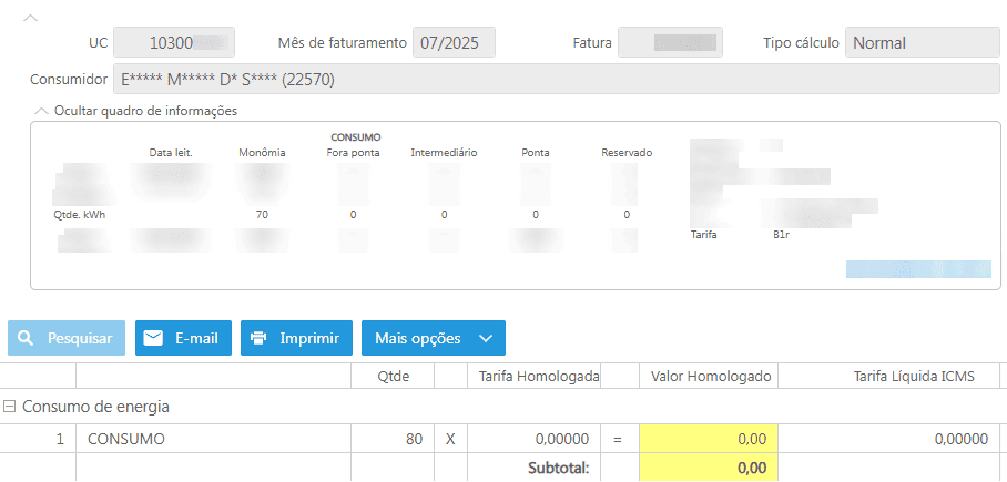 Observa-se que na fatura o consumo foi de 70 kWh, o sistema identificou que tratava-se de uma unidade baixa renda trifásica e então lançou o mínimo de 80 kWh que recebeu isenção total.