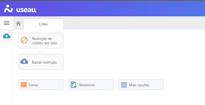 O módulo Lotes, possui as funções: Restrição de crédito em lote e Baixar restrição e o cadastro de Listas.