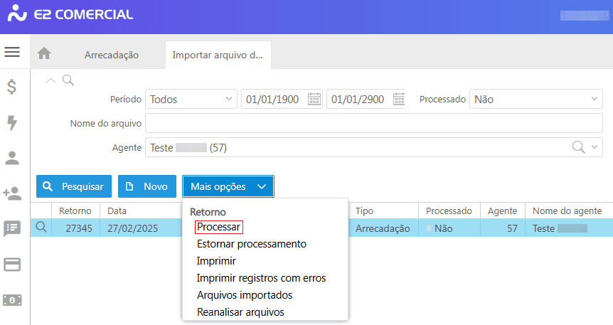 - Caminho: E2 Com > Comercial > Arrecadação > Importar arrecadação.