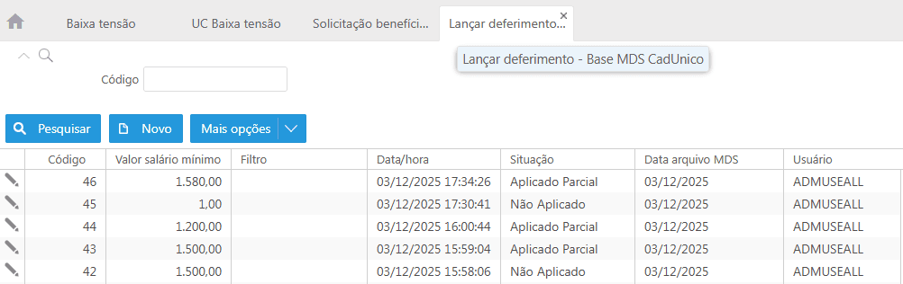 O primeiro, Pesquisar, faz a listagem dos registros inseridos no sistema. O segundo, Novo, permite gerar uma nova relação das UCs que atendem aos requisitos para utilizarem os benefícios sociais.