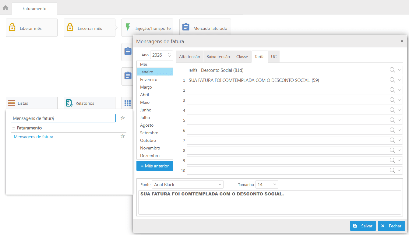 Para informar o cliente que sua fatura foi contemplada com o desconto social, cadastrar uma nova mensagem de fatura, para isso acessar o caminho abaixo.