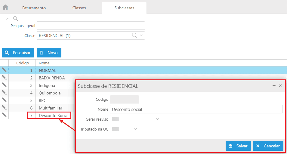 - Caminho: E2 Com > Faturamento > Listas > Consumidores > Classes > Buscar pela classe Residencial e selecioná-la > Mais opções > Subclasses.