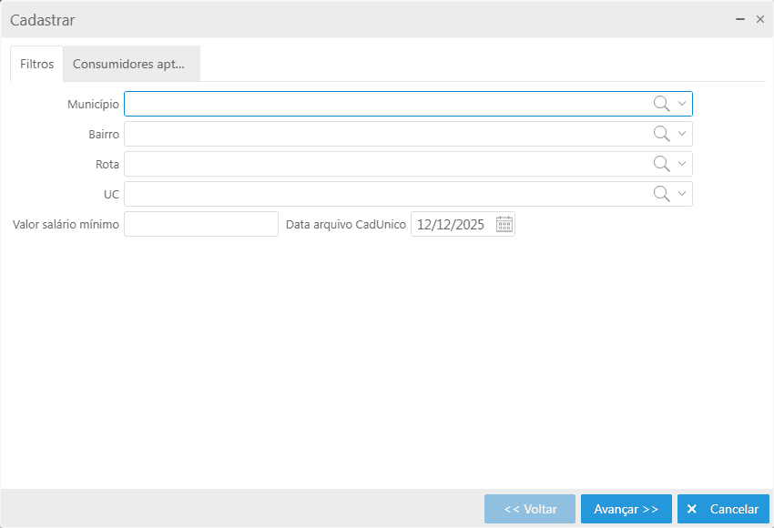 Para isso pode-se optar entre o preenchimento de alguns campos de filtros como Município, Bairro, Rota ou UC. Por fim o campo Valor salário mínimo é obrigatório e deve ser diferente de 0. Após preenchidos os filtros escolhidos e informado o valor do salário mínimo, basta clicar em Avançar.
