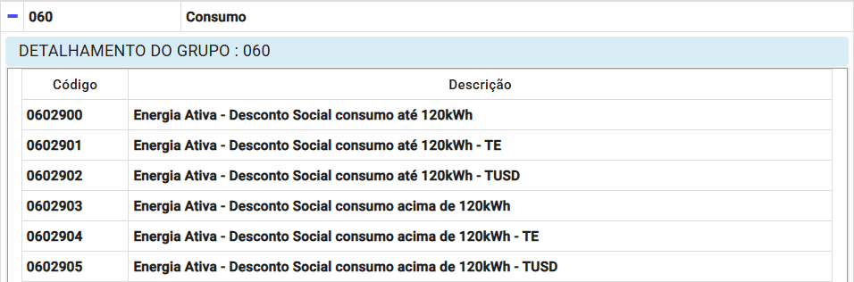 para expandir a tabela e então buscar pela parte final da listagem onde é possível observar que os códigos no intervalo de 0602900 a 0602905 destinam-se ao desconto social.