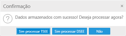 O próximo passo é clicar em Salvar. Neste momento o sistema questionará se é desejado processar o arquivo para concessão do benefício, assim serão apresentados três botões em tela Sim processar TSEE, Sim processar DSEE e Não.