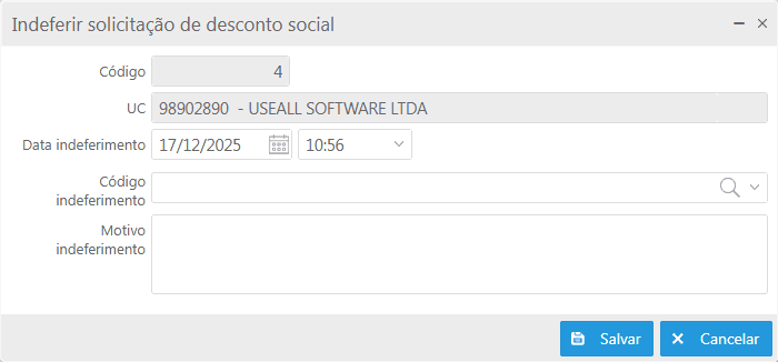 Para lançar o indeferimento deve-se preencher os campos Data indeferimento, Código indeferimento e Motivo indeferimento, em seguida clicar em Salvar.