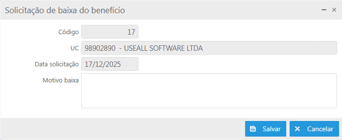 Ao exibir a tela, o sistema preencherá automaticamente os três primeiros campos, sendo eles Código, UC e Data solicitação. O campo seguinte trata da baixa onde deve-se informar qual a justificativa para remoção no campo Motivo baixa.