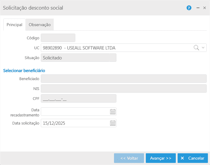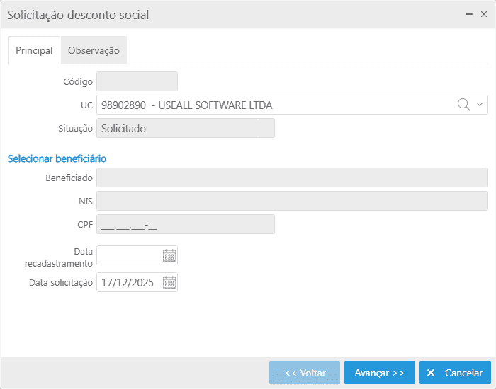 Os campos Beneficiado, NIS e CPF são automaticamente preenchidos conforme seleção do consumidor na opção Selecionar beneficiário localizado logo acima do campo Beneficiado.