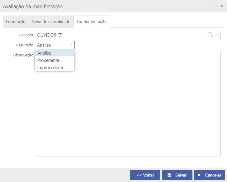 No campo seguinte Resultado, deve-se optar entre três opções Análise, Procedente e Improcedente. Por último o campo Observação, permite informar mais dados a respeito da análise.
