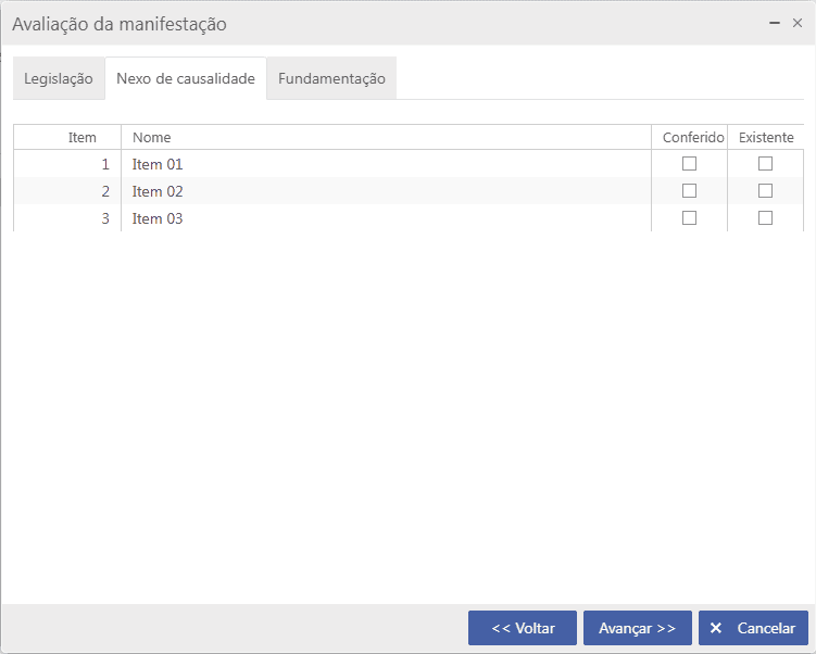Na aba seguinte, Nexo de causalidade, são apresentados os itens também pré-cadastrado por meio do sistema. Pode-se registrar o que foi constatado a respeito dos itens através da marcação das colunas Conferido e Existente.