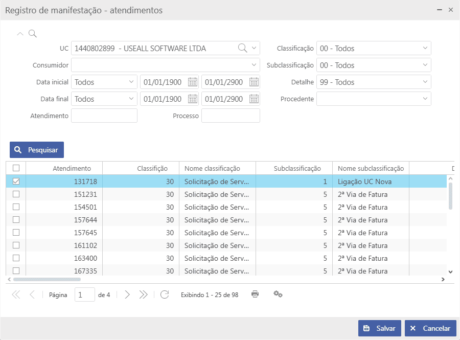 Utilizando os filtros, buscar pelo atendimento informado pelo consumidor e então selecionar o checkbox
