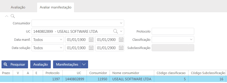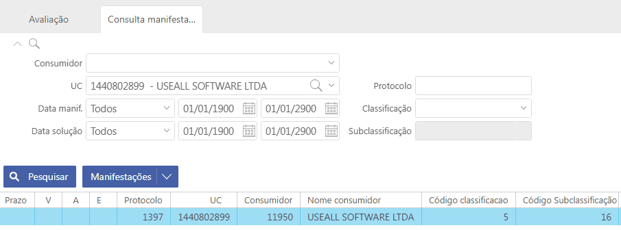 Neste sub-módulo é possível consultar as manifestações cadastradas no sistema, ao acessá-lo é visualizado um conjunto de filtros na parte superior da tela. Os filtros Consumidor, UC, Data manif., Data solução e Protocolo são campos simples de preenchimento, onde é possível inserir as informações conforme desejado.
