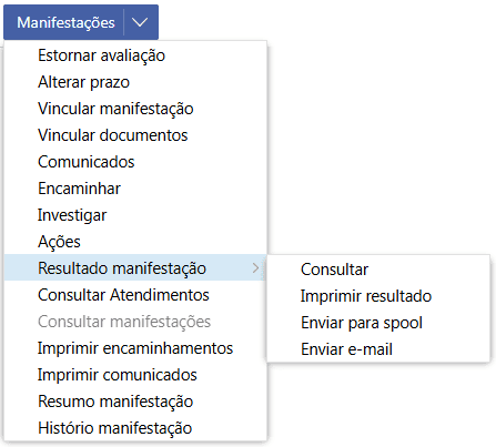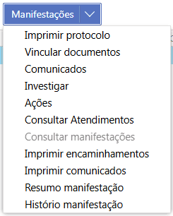 Este último botão, Manifestações, permite acessar uma lista de ações disponíveis para execução na manifestação.