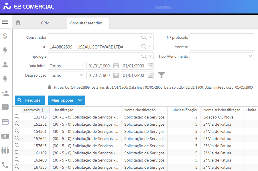 - Caminho: E2 Com > CRM > Consultar atendimentos.