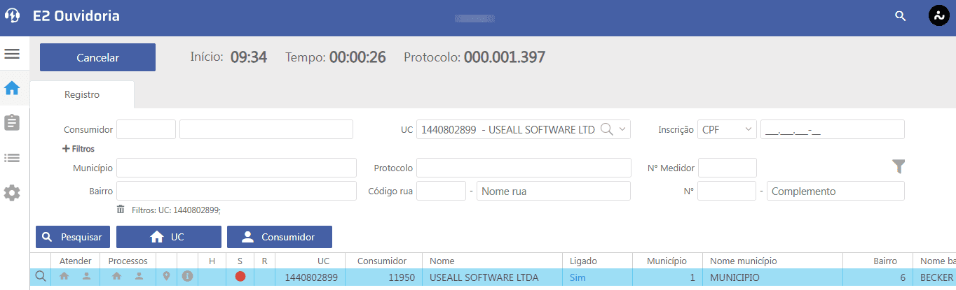 Após buscar a unidade ou o consumidor desejado por meio dos filtros, selecionar por qual parte a manifestação está ocorrendo, ou seja, se é uma questão da UC ou do Consumidor por meio dos botões em tela.
