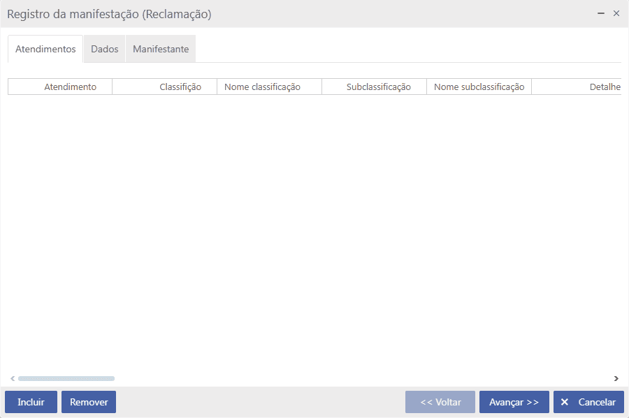 Nesta tela deve-se selecionar qual atendimento levou o consumidor a buscar a ouvidoria e realizar a manifestação, para isso clicar no botão Incluir localizado na parte inferior esquerda da tela.