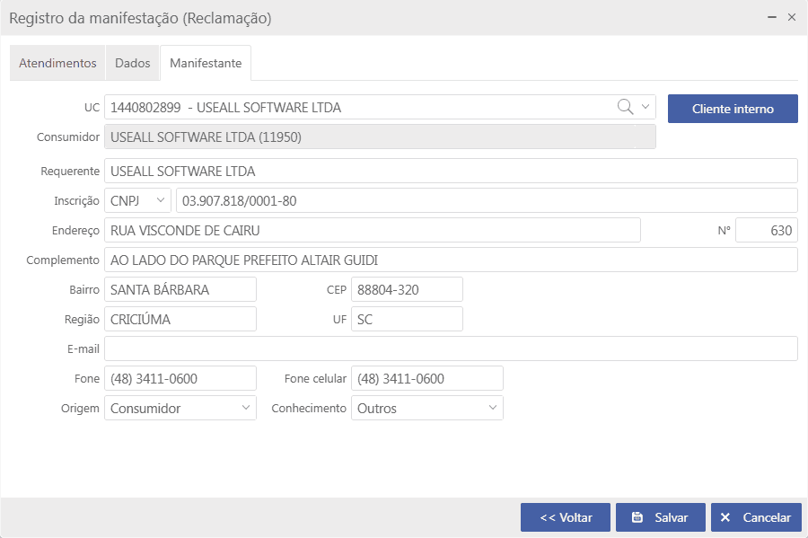 Na terceira e última aba, deve-se registrar informações a respeito do consumidor que esta registrando a manifestação. Dentre elas esta a unidades consumidora, nome, endereço, documento de identificação, meio pelo qual o consumidor entrou em contato e por qual meio a distribuidora foi comunicada. [O QUE É O CLIENTE INTERNO??]