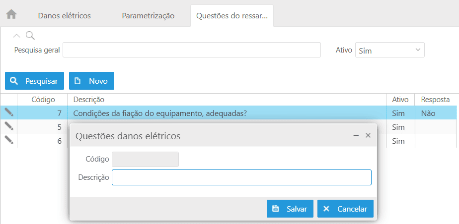 Efetuando o lançamento de um novo pedido de ressarcimento de danos elétricos, algumas questões prévias, já podem ser informadas para melhor andamento da solicitação posteriormente. A partir deste cadastro define-se as questões que serão respondidas já no lançamento do processo, com respostas variando apenas entre "Sim" ou "Não".