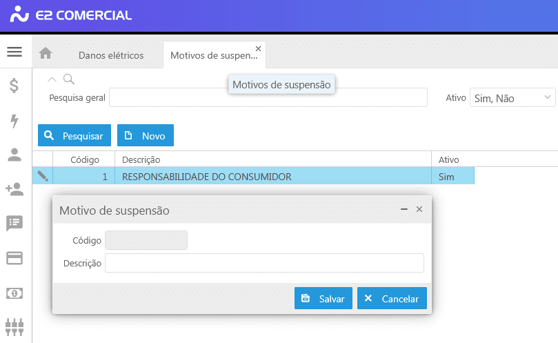 Localizados em "E2 Comercial > Danos elétricos > Listas", a seguir detalhes de como proceder em cada cadastro.