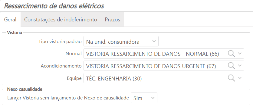 Em parametrização encontra-se a subdivisão Ressarcimento de Danos Elétricos onde através das abas Geral, Constatações de indeferimento e Prazos se estabelece algumas regras de funcionamento.
