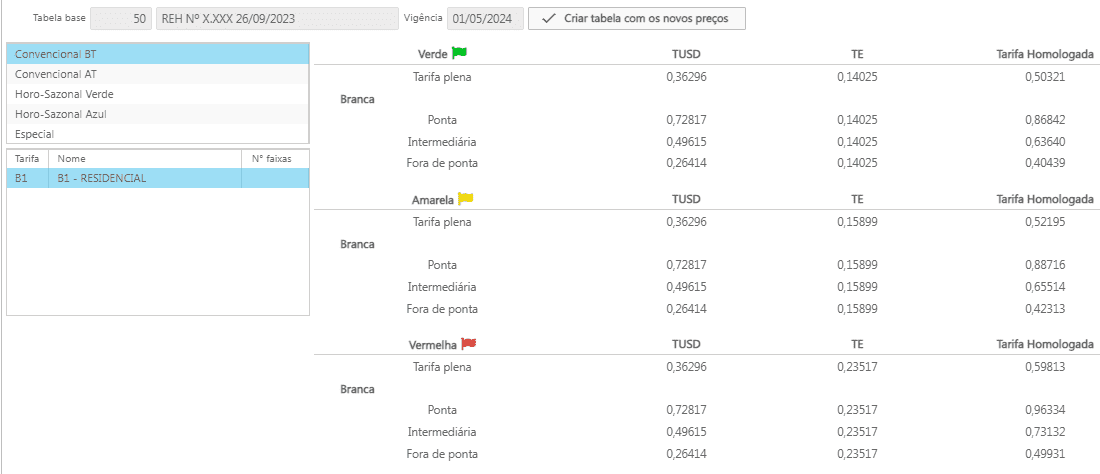 Lembrando que a tabela apresentada só conta com uma tarifa cadastrada, pois era a única cadastrada até o momento. É necessário realizar o cadastro de todas as tarifas utilizadas pelos consumidores, com base na resolução homologatória.