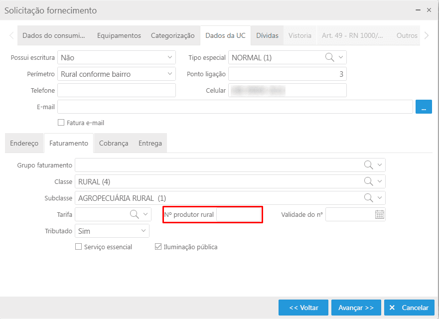 - Caminho: E2COM > CRM > Iniciar Atendimento > Selecionar o consumidor > Solicitação de fornecimento > Aba “Dados da UC”