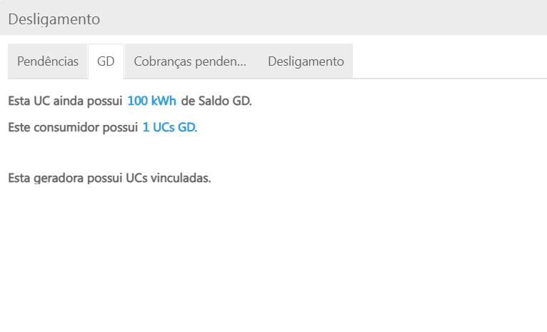 Quando efetuado o desligamento para uma UC GD, será observada a presença da aba intitulada "GD", nela será possível visualizar o total de saldo que a UC, a qual deseja-se desligar, possui.