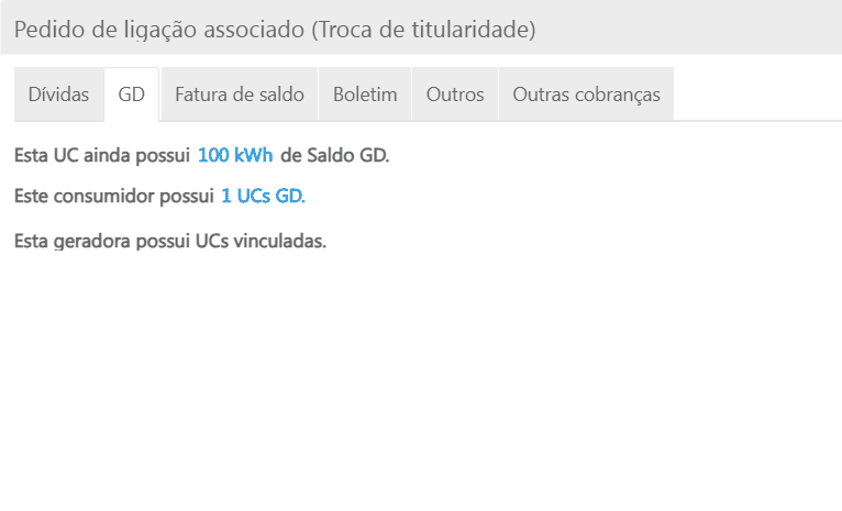 É importante lembrar que para que a aba "GD" conste tanto no desligamento quanto na troca de titularidade, a UC GD precisa possuir algum saldo disponível independente do canal ou grupo de transição. Caso o saldo esteja zerado, a aba não será apresentada.