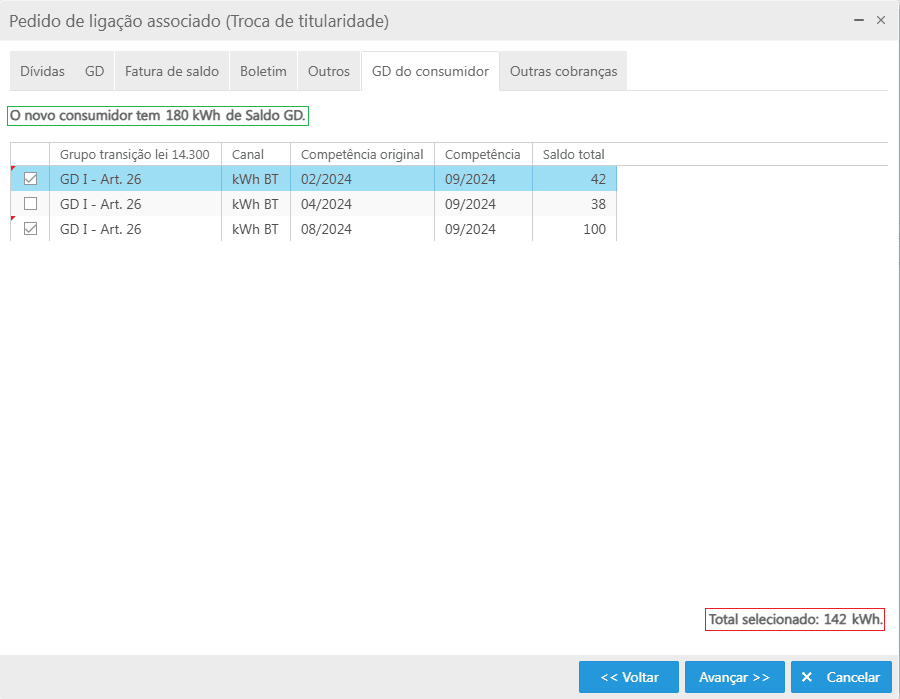 Como pode-se observar na imagem, o consumidor possui 180 kWhs GD informados na parte superior esquerda da tela, porém somente a primeira e a última linha estão selecionadas, assim apenas a soma destas duas será enviada para a UC, neste caso um total de 142 kWhs, conforme consta na informação na parte inferior direita da tela.
