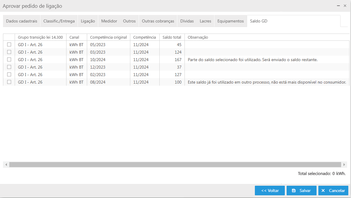 Este alerta será observado na aba também intitulada "Saldo GD", coluna Observação, presente no momento da aprovação do pedido de ligação.