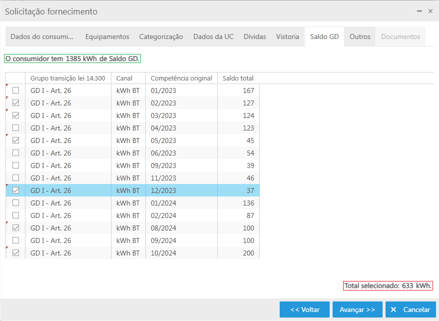 Neste lançamento, se observará a presença da aba "Saldo GD", que apresentará todo saldo GD do consumidor disponível divido por competência. Onde será possível