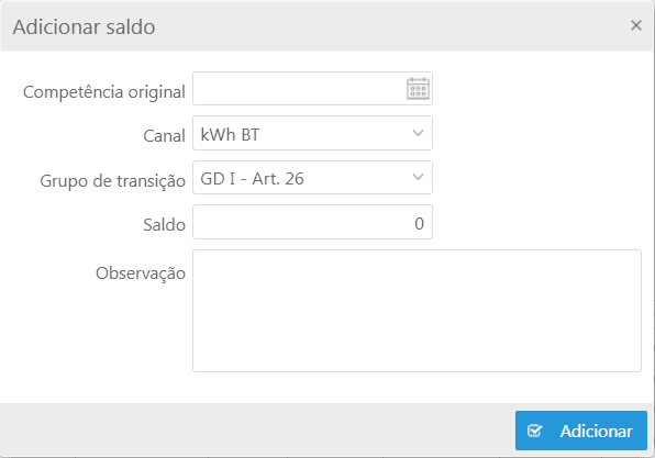 Em qual "Canal" foi gerado, a qual "Grupo de transição" pertence, quantia de kWhs em "Saldo" e por fim, em "Observação", será possível adicionar uma identificação a esta inserção.