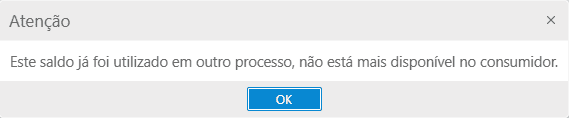 Já a observação Este saldo já foi utilizado em outro processo, não está mais disponível no consumidor, trata dos casos onde o saldo foi totalmente removido, assim ao tentar selecioná-lo para envio a UC, mais uma vez o sistema alertará e não permitirá a seleção.