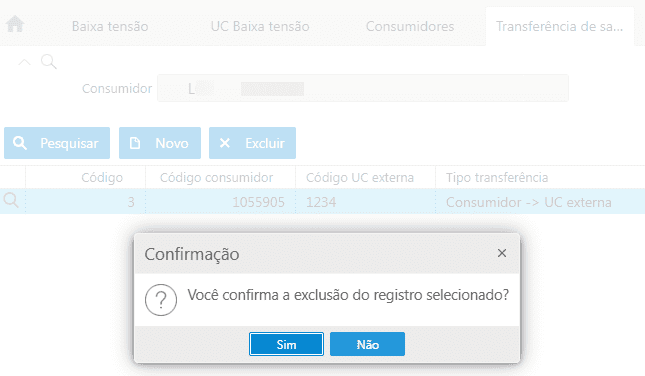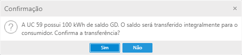 Em ambos os processos, ao salvá-los a seguinte mensagem será disparada: "A UC XX possui YYY kWh de saldo GD. O saldo será transferido integralmente para o consumidor. Confirma a transferência?". Onde XX representa o código da UC e YYY representa o montante de saldo que a UC possui.