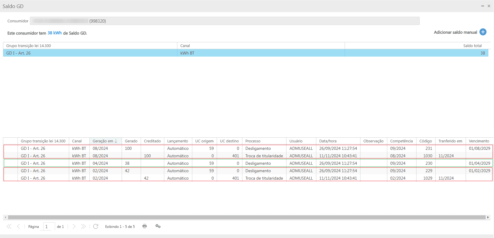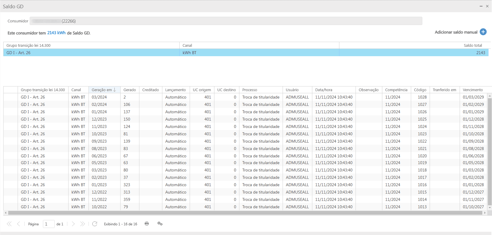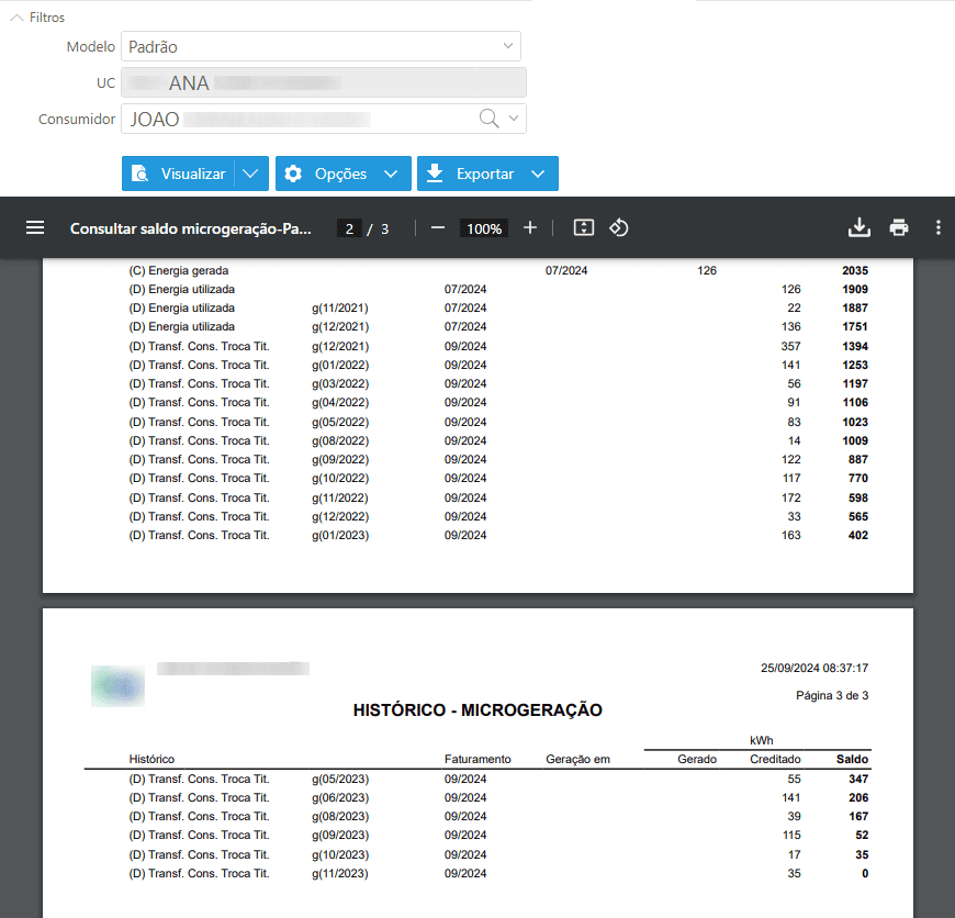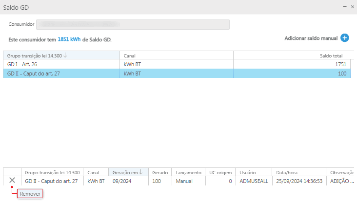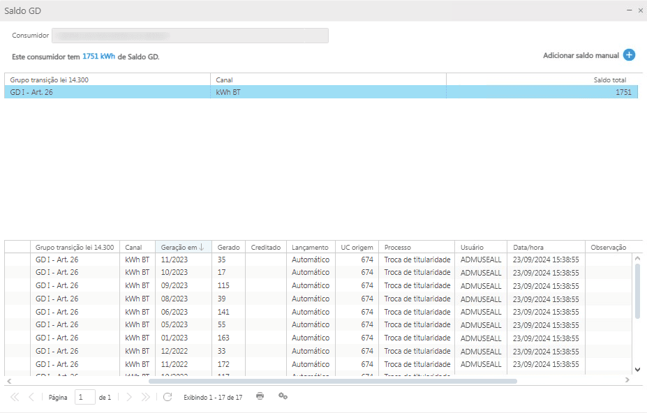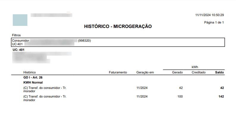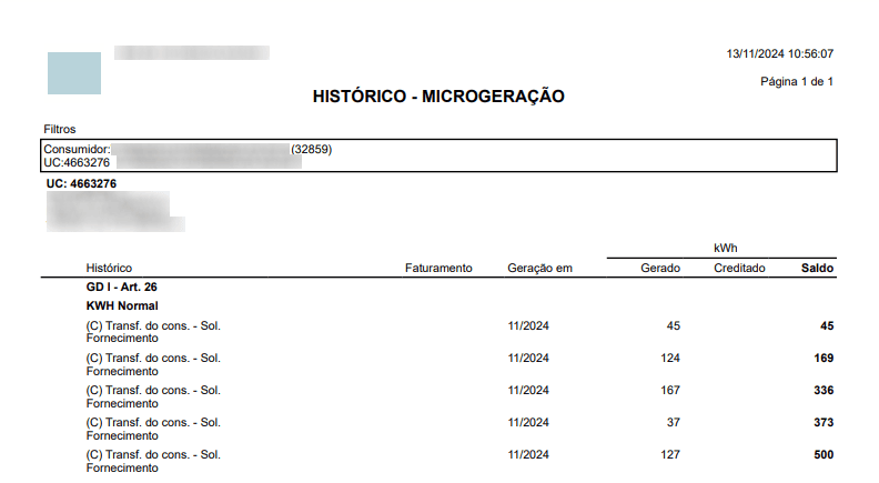 Por fim, o histórico de saldo GD do consumidor anterior, apresenta todos os registros de saldo gerado e armazenado na titularidade dele, para posterior utilização.