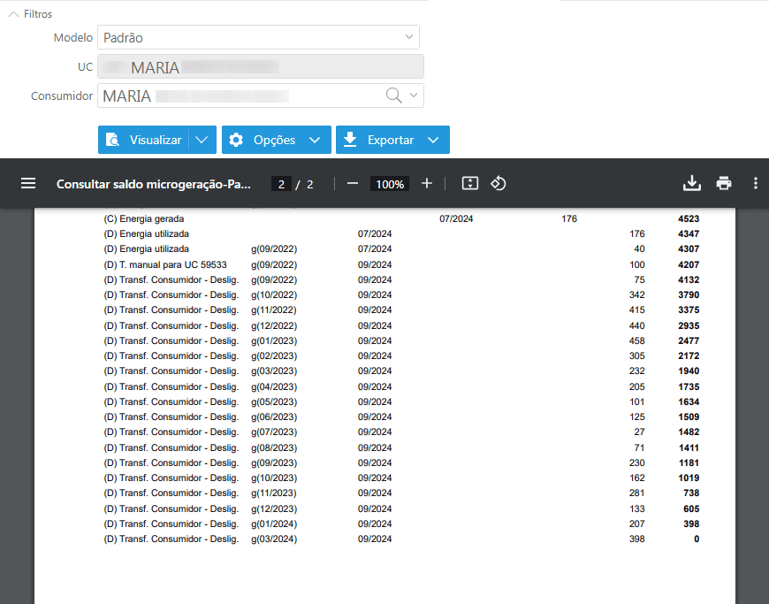 Após seleção da opção Visualizar, será observado que as movimentações feitas para o consumidor estarão identificadas com (D) Transf. Consumidor - Deslig., quando a UC GD passar por um desligamento, e estarão divididas por competência de origem do saldo.