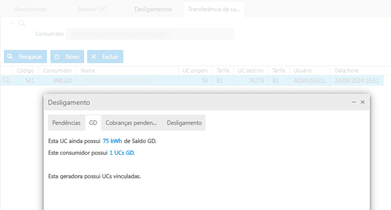Para atendimento da Resolução Normativa nº 1000, artigo 655-M, parágrafo 3º, a partir da versão 5.4.102/682, foi realizada a liberação da opção de transferência do saldo excedente, de UC mini ou microgeradora para seu consumidor titular, quando a unidade consumidora passar por desligamento ou troca de titularidade, cujo o titular não possua outra UC GD, nem vinculadas atendida pela mesma distribuidora.