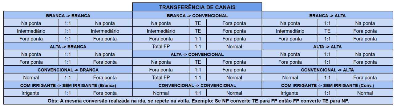 Em caso de UCs irrigantes, se a transferência for para uma UC tarifa branca, o canal que receberá o saldo será o Fora Ponta; mas se a UC que receber for convencional, então será transferido diretamente para o canal normal, em ambas as situações, sem conversões.