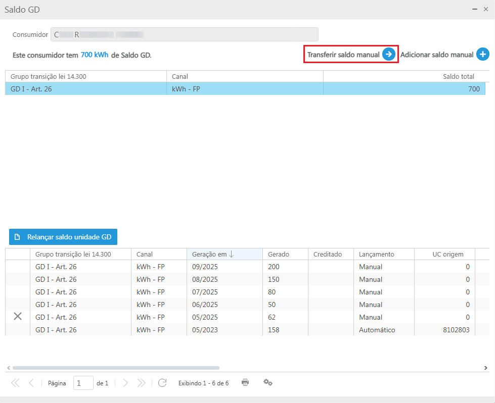 Transferência de saldo GD do consumidor para a UC