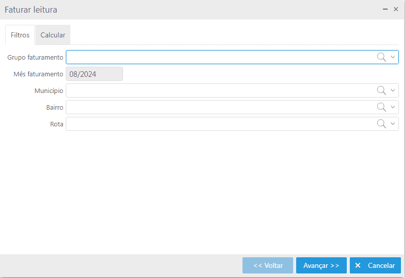 Uma nova janela será apresentada, a primeira aba “Filtros”, como o nome já diz, disponibiliza vários filtros para a seleção das leituras que serão faturadas.