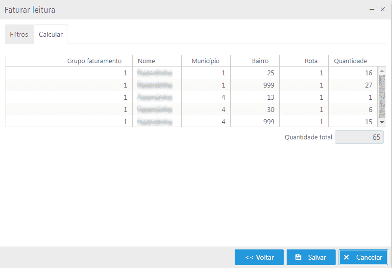 Na aba “Calcular”, serão apresentadas informações gerais das leituras que serão faturadas. Podem ser identificadas através das colunas Grupo faturamento, Município, Bairro e Rota.